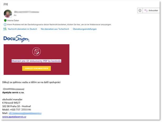 v současné době informujeme své zákazníky a obchodní partnery o podvodném e-mailu, který se nyní šíří prostřednictvím internetu a který se tváří jako zpráva od služby DocuSign. Pokud se k Vám již toto upozornění dostalo, není třeba se tímto sdělením dále zabývat. Pokud jste dosud o události informováni nebyli, věnujte prosím tomuto sdělení Vaši pozornost.